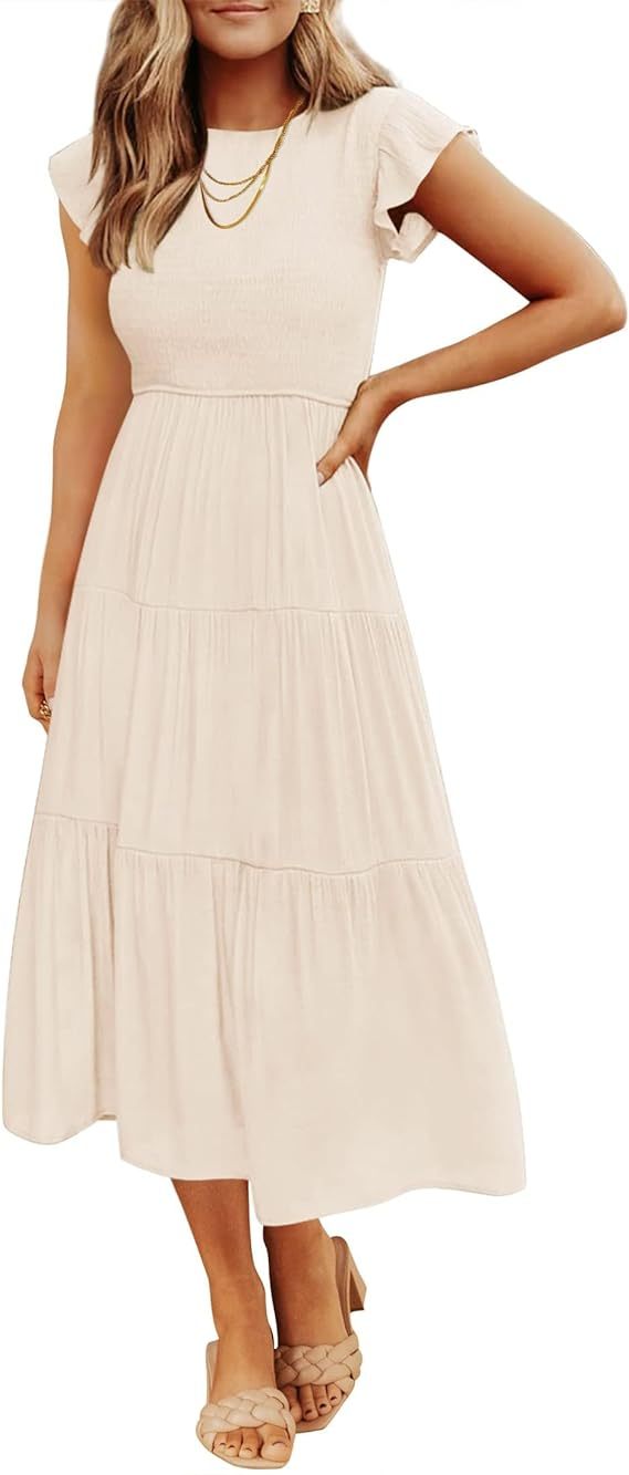 Women's Summer Casual Flutter Short Sleeve Crew Neck Smocked Elastic Waist Tiered Midi Dress